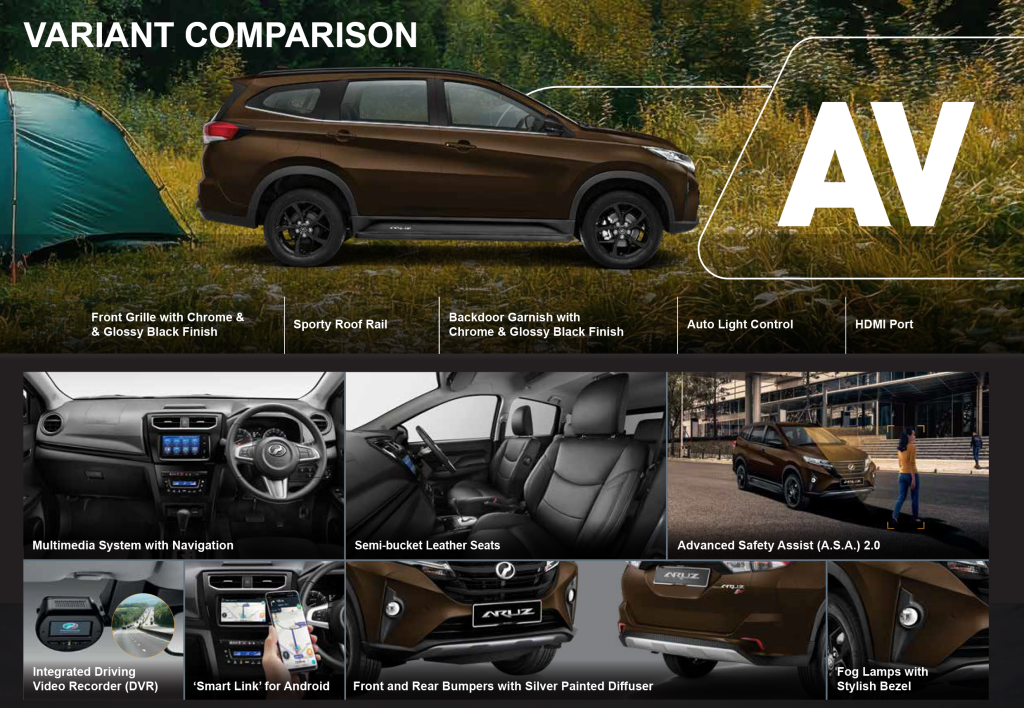Aruz mempunyai 2 varian iaitu X dan AV dengan kedua-dua ini dilengkapi dengan:-